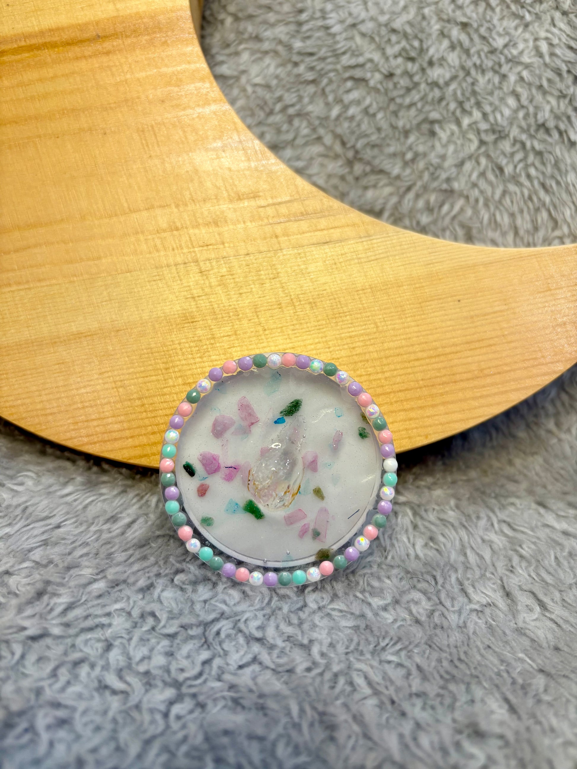 This resin phone grip features a clear quartz stone and crystal confetti.